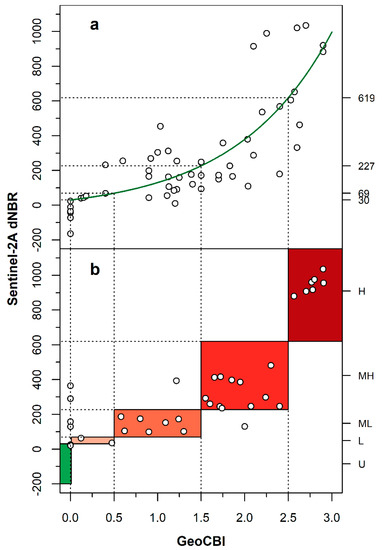 Owing to the non-linearity and the saturation of the relationship between field and satellite burn severity indices [42], the performance of the two dNBR as satellite-metrics of burn severity were tested by applying the non-linear regression model developed by Miller and Thode [47] for Mediterranean wildfires on both field-based indices (FBIs):