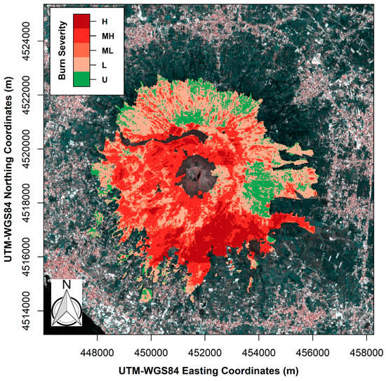 Burn severity map of Vesuvius National Park after the summer wildfires occurring in 2017. The capital letters H, MH, ML, L, and U correspond, respectively, to the following burn severity classes: High, Moderate-high, Moderate-low, Low, and Unburnt (see also Table S1).