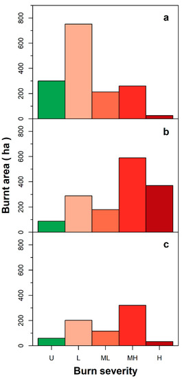 Area (ha) burnt by wildfires in summer 2017 in the Vesuvius National Park classified according to burn severity classes. Panels (a), (b), and (c) represent broadleaved species, Mediterranean conifers, and shrubland, respectively. See caption of Figure 2 and Table S1 for the burn severity class codes U, L, ML, MH, and H.