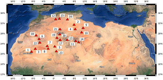 Grid points that were not covered by four measurements were not included in the final grid. These points correspond mainly to high altitude zones (>650 m), for which the data were not analyzed (see above regarding data filtering). Figure 5 shows the resulting reflectivity map at a resolution of 0.03° × 0.03°, which covers the latitudes between 15°N and 37°30’N and the longitudes between 17°W and 39°30’E. Mountainous regions higher than 650 m—for example, the Hoggar Mountains in the South-East of Algeria, the Tibesti Mountains in the southern Libya, and the Atlas Mountains in the North-East of Morocco (Maghreb)—are not mapped. Regions with sand dunes, such as the Western and Eastern Erg in the North-West and North-East of Algeria respectively, the Great Libyan Desert in the East of Libya bordering with Egypt, and the Aoukar Erg in the South-East of Mauritania, are recognizable by their lower received signals due probably to a high wave penetration in soil. In Figure 5, mountains and areas with low received signals are masked in white.
