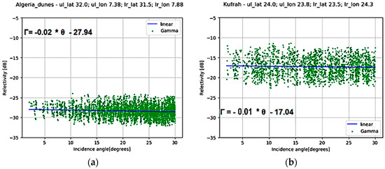 Plot of variations in Cyclone Global Navigation Satellite System (CYGNSS) reflectivity as a function of incidence angles: (a) Algeria dunes, (b) Kufrah area.
