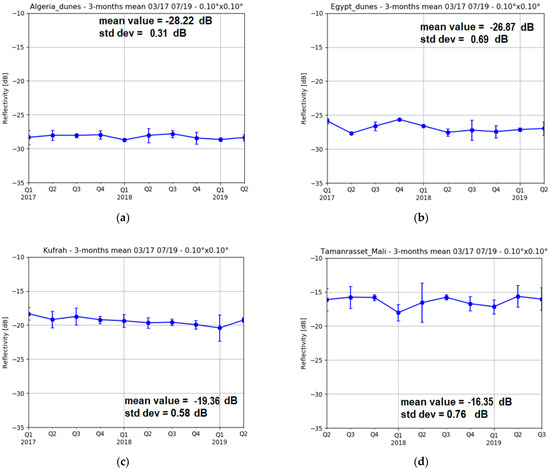 In the case of desert areas, remotely sensed signals, and in particular microwave measurements, are in general found to be very stable [7,8]. In this context, in order to ensure that the retrieved values of reflectivity are accurate, it is essential to evaluate their temporal stability. Figure 3 plots the signals retrieved in the four areas cited in Table 2, characterizing different types of surface (dunes, smooth surfaces, relief). A 2.5-year time series is shown for each zone, with the plotted values corresponding to the mean reflectivity within a 3-month period and a relatively small (0.1° × 0.1°) zone. For some months of the year, no data were available since no specular points corresponding to such a small zone were detected. The reflectivities plotted in Figure 3 confirm the high temporal stability of the reflectivity data, with a negligible standard deviation (std dev), less than 0.7 dB for three of these sites.