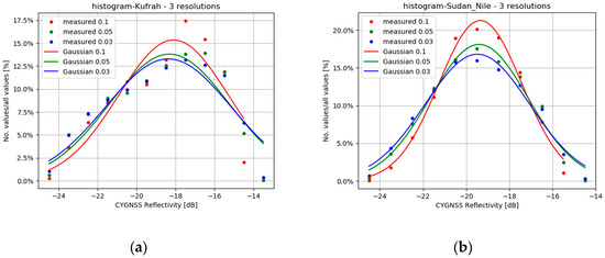Following the normalization of the CYGNSS measurements and validation of the stability of the Sahara’s reflectivity during the studied period, the data were arranged in a grid format, each pixel of which corresponds to the mean value over the full period of observation; i.e., nearly 2.5 years. The challenge of this process is to retain the finest possible grid resolution, with the constraint of using a sufficiently large number of observations to ensure the accuracy of the resulting average value. For this purpose, three different resolutions were tested. Figure 4 shows the reflectivity histograms obtained with resolutions of 0.1°, 0.05° and 0.03° (close to 3.5 km), and simple Gaussian distributions fitting the experimental data. It can be seen that this approximation is better adapted to the Sudan-Nile site (Figure 4b) than to the Kufrah site (Figure 4a). This could be explained by the presence of strong heterogeneities at the former site, which includes both flat and mountainous areas.