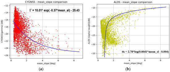 Plot of roughness mean slope and satellite data: (a) CYGNSS reflectivity, (b) ALOS-2 backscattering coefficient.