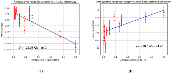 Plot of the aerodynamic roughness length as a function of satellite data: (a) CYGNSS reflectivity, (b) ALOS-2 backscattering coefficient.