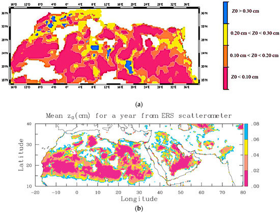 Maps of aerodynamic roughness classes over the Sahara desert: (a) derived from a CYGNSS reflectivity database, (b) derived from the European Remote-Sensing Satellite (ERS) scatterometer (Prigent et al. [4]).
