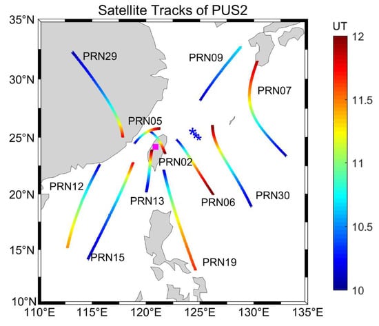 - Afraimovich, E.L.; Voeykov, S.V.; Ishin, A.B.; Perevalova, N.P.; Ruzhin, Y.Y. Variations in the total electron content during the powerful typhoon of August 5–11, 2006, near the southeastern coast of China. Geomagn. Aeron. 2008, 48, 674–679. [Google Scholar] [CrossRef]