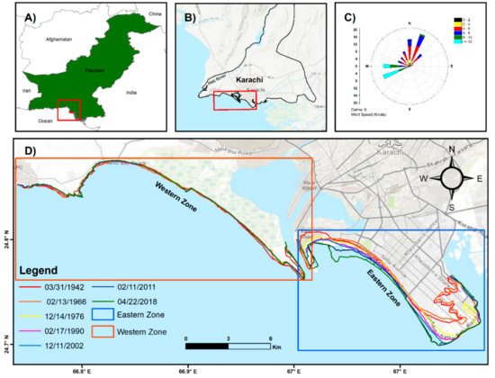 (A) Map of Pakistan with a demarcation of the study area (filled red rectangle). (B) Geographical location of the coastal city, Karachi, where the red rectangle shows the study area. (C) Wind climatology of the study area and (D) historical shoreline positions of the Karachi coast in the eastern and western zones.