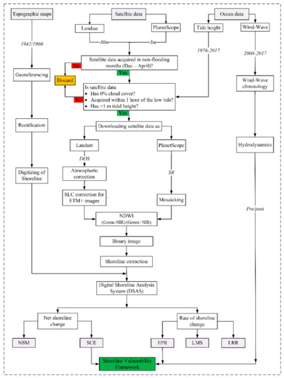 Images for the same months of different years for several decades enabled us to investigate the variability of shoreline morphology with nominal inherited measurement and positional uncertainty [15,43,58,59]. Therefore, we only selected Landsat (L2, L5, L7, and L8) and PS images that met the following conditions: (1) 0% cloud cover over the study area, (2) non-flooding months (December to April), and (3) tide height of <1 m within a time window of ±1 h of the image acquisition time. Non-flooding months provided information about the stability of the ocean condition because tropical storms mainly prevail during the months of May to June and September to November [16]. Furthermore, low tide height provided stable outer boundaries of the coastline [4,5,26,59]. This image selection criteria (Figure 2) resulted in a limited number of images available, including four images from Landsat sensors and one from PS which was prioritized over the OLI images due to a higher resolution (Table A1). The image selection criteria in this study was helpful in reducing or removing the inherited seasonal uncertainty in shoreline change analysis.