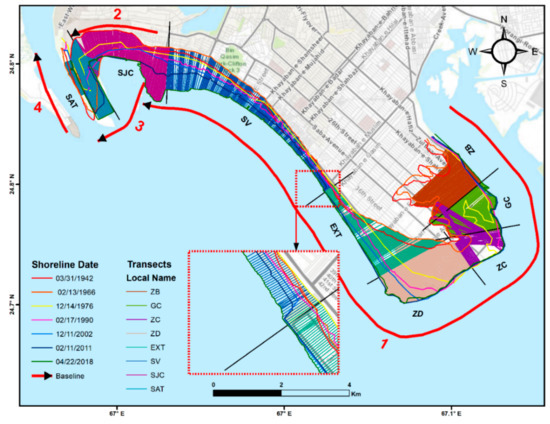 Digital shoreline analysis on the eastern zone (inset red doted rectangle shows a part of the study area) (ZB = Zone B; GC = Golf Club; ZC = Zone C; Ext = Extension, SV = Sea-view, SJC = Shireen Jinnah Colony, and SAT = South Asian Terminal) (Table 1).