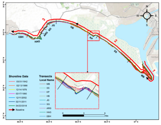 Digital shoreline analysis on the western zone (inset red doted rectangle shows a part of the study area) (MB = Manora Beach, SS = Sandspit, KK = Kaka Pir, HB = Hawks Bay, JG = Jamali Goth, SG = Somar Goth, ARG = Abdul Rehman Goth, HAJ = Haji Ali Goth, and EBH = Engro Beach Huts) (Table 1).