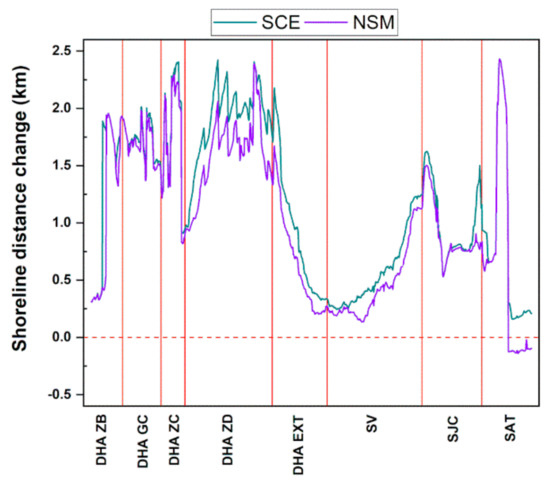 Shoreline change (NSM, SCE) of the western zone (MB = Manora Beach, SS = Sandspit, KK = Kaka Pir, HB = Hawks Bay, JG = Jamali Goath, SG = Somar Goath, ARG = Abdul Rehman Goath, HAJ = Haji Ali Goath, EBH = Engro Beach Huts).