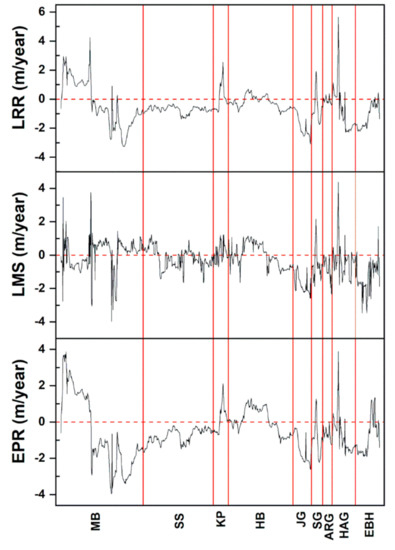 Shoreline change rate (EPR, LMS, LRR) of the western zone (MB = Manora Beach, SS = Sandspit, KP = Kaka Pir, HB = Hawks Bay, JG = Jamali Goath, SG = Somar Goath, ARG = Abdul Rehman Goath, HAJ = Haji Ali Goath, EBH = Engro Beach Huts).