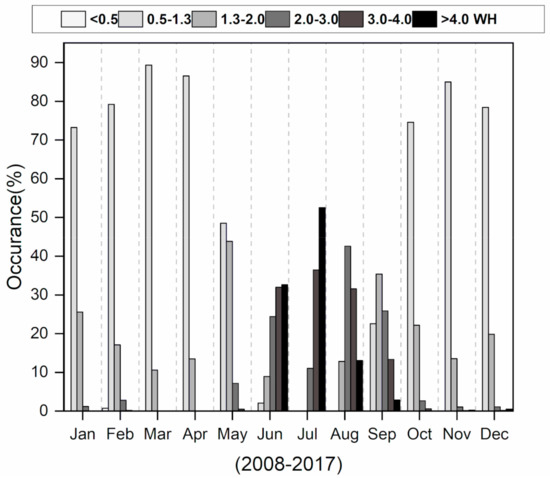 Surprisingly, 22% of the time WH exceeded 4 m, and occasionally reached 6 m due to a rising tide, generated by heavy SW winds of WS above 12 knots (Figure 13). During the SW monsoon, high-energy southwesterly waves strikes the coast, accelerating erosive action in the western zone and sediment deposition in the eastern zone from longshore drift. During the retreat of the monsoon season (Oct–Nov), northeasterly winds with an average WS of 5 knots generated waves with an average WH lower than 1 m and a mean WP of 11 s. During this season, 86% of the observed time WS was observed to be between 3–9 knots, which generated small waves with a significant WH lower than 2 m (Figure 12). Furthermore, during the northeastern (NE) monsoon transition season (Dec–Feb), northeasterly winds (Figure 10) with a low mean WS of 5 knots generated small wavelets of an average 1 m wave height, of 1 m, which allowed the settling of suspended sediments. During this season, the NE wind remained lower than 9 knots for 99% of the time (Figure 13) and WH remained less than 2 m for 98% of the time (Figure 12).