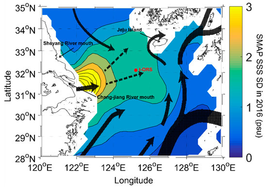 Soil Moisture Active Passive (SMAP) standard deviation (SD) of sea surface salinity (SSS) in 2016. Black arrows indicate typical ocean currents during summer season from 2002 to 2005 in this region (provided by Korea Hydrographic and Oceanographic Agency). Location of Ieodo Ocean Research Station (I-ORS) is marked with a solid red circle. Regions of more than 1 psu of SD were chosen to train multilayer perceptron neural network (MPNN) algorithm.