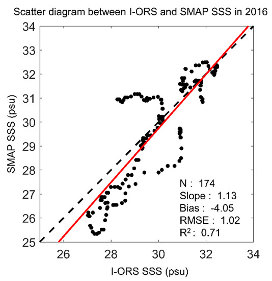 Scatter diagram between I-ORS and SMAP SSS in 2016.
