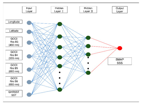 To overcome such limitations, Geiger et al. [18] used a neural network (NN) approach to estimate the SSS in the coastal Mid-Atlantic region using marine environmental variables and ocean color measurements. The strengths of a NN approach are that the assumptions made by calculating the CDOM from optical signals are not required, and that the inclusion of other parameters, such as SST, is possible. Indeed, they demonstrated that the SST is an essential parameter to estimate the SSS in four different coastal regions (the coastal Mid-Atlantic region, the Chesapeake and Delaware bays, and the Hudson Estuary). In addition, Chen and Hu [19] estimated the SSS from ocean color and SST measurements using a multilayer perceptron neural network (MPNN) in the northern Gulf of Mexico after extensive evaluations testing many other empirical approaches (i.e., principle component analysis, multi-nonlinear regression, decision tree, random forest, and supporting vector machines). They demonstrated the robustness of their MPNN model for estimating the SSS using the input errors. Because the CDW is highly correlated with the SST in the ECS in the summer season [9], an MPNN approach was used in this study instead of a CDOM approach in order to use the SST measurement. The importance of SST is discussed via an evaluation of the model performance in this study.