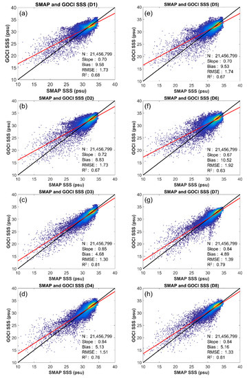 Density scatter diagram between SMAP and Geostationary Ocean Color Imager (GOCI) SSS estimated by (a) D1, (b) D2, (c) D3, (d) D4, (e) D5, (f) D6, (g) D7, and (h) D8 input dataset. Color indicates scatter density.