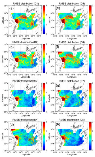 Root mean square error (RMSE) maps between SMAP and GOCI SSS estimated by (a) D1, (b) D2, (c) D3, (d) D4, (e) D5, (f) D6, (g) D7, and (h) D8 input dataset.