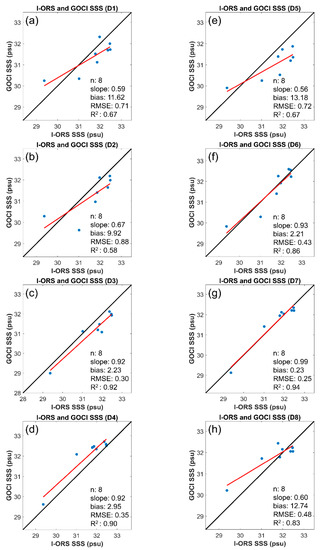 Scatter diagrams between I-ORS and GOCI SSS estimated by (a) D1, (b) D2, (c) D3, (d) D4, (e) D5, (f) D6, (g) D7, and (h) D8 input dataset.