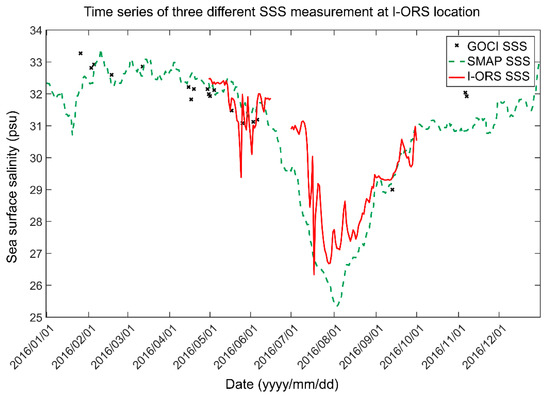 The model developed in this study enables the SSS distribution to be monitored with high spatial and temporal resolution using GOCI and SST measurements in the ECS. Figure 9 shows the monthly distribution of the SSS in 2016 as estimated by SMAP. The monthly SMAP SSS map shows that the SSS distribution in the ECS and the adjacent seas around the Korean Peninsula are primarily affected by the CDW in the summer season. However, SMAP SSS has coarse spatial scale (25 km) SSS distribution despite CDW extension revealed more detail shape and pattern in the past studies [26,42]. Conversely, the monthly GOCI SSS maps represent the SSS variability at small scales (500 m) as well (Figure 10). In this figure, intricate relatively low SSS features are observed even in the monthly averaged SSS images. In addition, Figure 11 shows a time series of three different SSS measurements at the I-ORS location. The SMAP and I-ORS SSS represent relatively low SSS conditions during the summer season. Even though the GOCI SSS did not observe this location during July and August, the overall pattern reveals a good agreement with the SMAP and I-ORS SSS. In addition, the model shows a reasonably good performance at the I-ORS location and is capable of detecting and monitoring the SSS in the ECS.