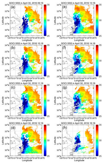 Hourly GOCI SSS distribution in April 30, 2016 at the local time of (a) 09:16, (b) 10:16, (c) 11:16, (d) 12:16, (e) 13:16, (f) 14:16, (g) 15:16, and (h) 16:16. Such hourly GOCI SSS measurements permit the SSS monitoring with high spatial and temporal resolutions.
