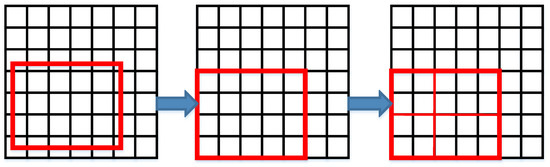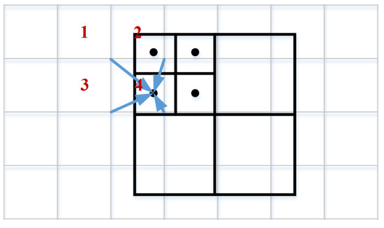 As shown in Figure 5, the dotted part represents the feature diagram and the solid line represents RoI. RoI is divided into 2 × 2 cells. If the sampling point is 4, we first divided each cell into four small squares as shown with the black line in Figure 5, with the center of each square being the sampling point. The coordinates of these sampling points were usually floating point numbers; thus, bilinear interpolation is required for the sampling pixel. Then, the pixel value was calculated: As shown by the four arrows, each corresponded to the pixel value of 1, 2, 3 and 4. Finally, the four sampling points in each cell are max-pooling and the method of RoI Align can obtain the final result.