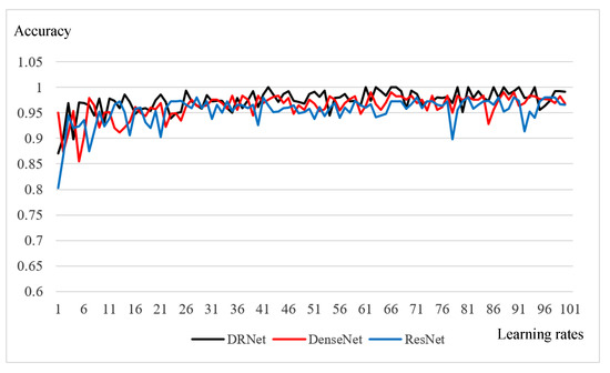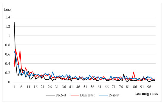 During the training, the training time of an Epoch was approximately 580.8 s for DRNet, 557.8 s for DenseNet and 517.6 s for ResNet. Although the DRNet network was relatively complex, the training time did not increase much. After the training, the accuracy curve of the three networks is shown in Figure 6. Obviously, the model using DRNet as the basic network has a higher accuracy, slightly better than the other two models, and with the decrease of learning rate, the image disturbance is small. The loss curve of the three networks is shown in Figure 7. Using the DRNet network model, the loss fell faster than it did in the other two models, and the final loss value was slightly less than the other two models; thus, the training effect of DRNet model is better.