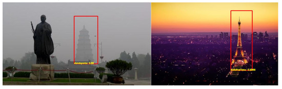 At the same time, the RoI Align layer model also has a good recognition effect on buildings in complex environments (in fog weather or at night) that are difficult to be recognized by the original model, as shown in Figure 10.