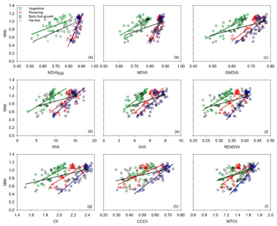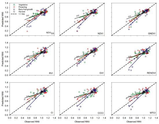Validation results (slopes of linear regression between observed and predicted NNIs values, and relative errors) were consistent with the evaluation conducted taking into account results of regression of both calibration and validation datasets [49]. There was a clear tendency for better performance of most vegetation indices in the early fruit growth stage, followed by the flowering stage. The performance of most vegetation indices was worse in the vegetative and harvest stages, most likely due to the characteristics of the crop canopy in these two stages, insufficient foliage density in the vegetative stage, and aging foliage in the harvest stage, as discussed previously.