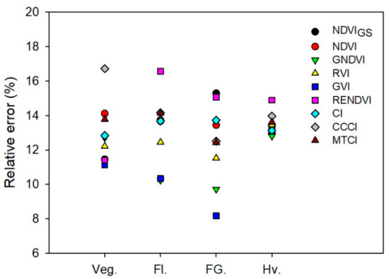 The relative error (RE) of the validation analysis for all vegetation indices evaluated in each phenological stage are presented in Figure 3. For the vegetative, flowering, and early fruit growth stages, RE ranged from 8% to 17%, with average RE values, for all indices, of 12.9% ± 0.59%, 13.2% ± 0.66% and 12.4% ± 0.78%, respectively. In the harvest stage, the RE ranged from 12% to 15%, with an average value of 13.5% ± 0.21% for all indices. The vegetation indices GVI and GNDVI had consistently lower RE values in most of the phenological stages (average RE values across phenological stages of 10.7% ± 1.03% and 11.3% ± 0.81%, respectively), followed by the RVI index (averaged RE values across phenological stages of 12.4% ± 0.40%). The GVI had the lowest RE in the vegetative, flowering, and early fruit growth stages (Figure 3). In contrast, the RENDVI index was the vegetation index with highest RE values throughout the four phenological stages (average value of 14.5% ± 1.09%).