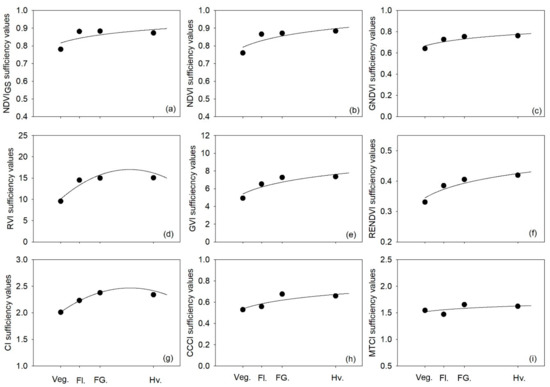 Sufficiency values of each vegetation index, for each phenological stage, were calculated from the regression equations of the calibration datasets. The equations of calibration for each phenological stage were solved for NNI = 1, according to Lemaire et al. [23].