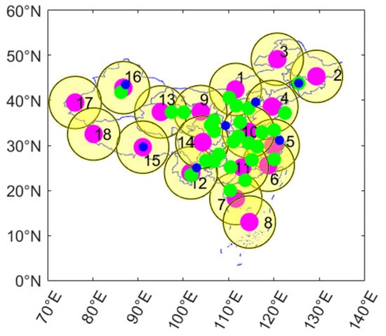 Chinese Beidou navigation system (BDS) satellite-based augmentation services (SBAS) partitions and distribution of precise point positioning (PPP) stations. The coverage of each partition is represented by a circle with radius of 800 km, where the partition center is plotted in pink dot. Blue dots are International GNSS Monitoring and Assessment System (iGMAS) sites and Crustal Motion Observation Network of China (CMONOC) sites are in green.