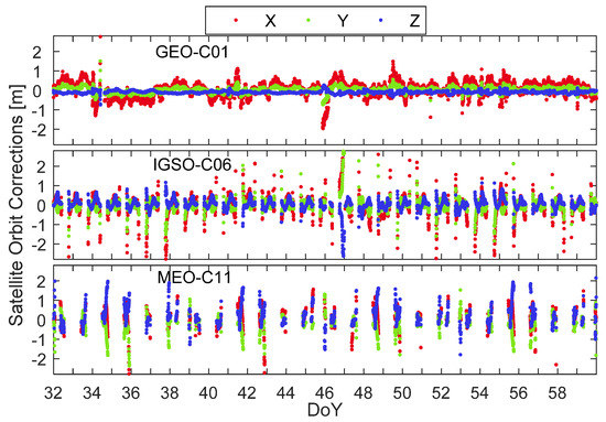 Figure 2 shows the real-time orbit corrections for C01, C06, and C11 over one-month results, and Table 1 gives the statistical results in three directions under ECEF. It was observed that most corrections were within the range of ±2 m, with a standard deviation (STD) of less than 0.6 m. Meanwhile, apparent periodical terms were observed for all the three components for IGSO and MEO satellites. There existed discontinuity in the time series of IGSO and MEO, which may due to the limited tracking capability of BDS ground tracking network. The visible period was around 62.67% and 22.18% for C06 and C11 and this was the typical visibility for all IGSO and MEO satellites of the BDS Ground Control Segment (GCS). For both IGSO and MEO satellites, the orbit corrections were relative larger during the entering and setting phases, and this may owe to the prediction errors of the long-time non-visible the poor observation geometry. For the GEO satellites, the Z component orbit corrections were close to zero. As the Z axis of GEO satellite was very close to the orbit radial direction, we converted the corrections from X/Y/Z in ECEF to radial/along/cross direction in satellite-fixed coordinate system and found that the radial corrections were all zero, which implies that zero-constrain has been applied to the GEO orbit correction estimation in the BDS GCS.