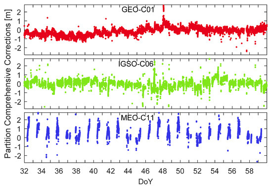 Partition comprehensive correction is the most unique SBAS corrections as broadcasted by BDS [8,20]. As an example, Figure 5 shows the real-time partition comprehensive corrections of C01, C06, and C11, in partition No. 6; Table 3 presents the statistical results. Similar to the other BDS SBAS corrections, the PCC was continuous for GEO satellites and showed breaks for IGSO and MEO satellites. The variation range of PCC for IGSO and MEO satellites was relatively smaller than the satellite clock corrections, due to the fact that a large amount of errors were corrected using the orbit/clock corrections. Because the observation geometry changed slightly for GEO satellites, the residual regional environment corrections were also stable, which resulted in small PCC variation and less outliers for GEO satellites.