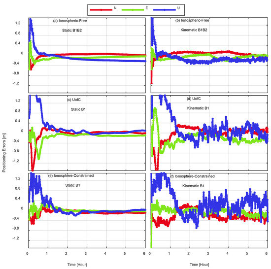 Typical BDS SBAS corrections-based PPP coordinate error series for (a) static B1B2, (b) kinematic B1B2, (c) static B1 UofC, (d) kinematic B1 UofC, (e) static B1 Ionosphere-constrained, and (f) kinematic B1 Ionosphere-constrained at SNMX station (DoY 37 in 2019).