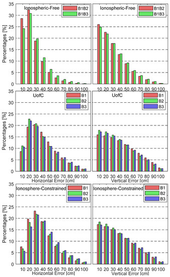 It can be seen that most of the horizontal errors were distributed in the range of less than 0.3 m and 0.5 m for ionospheric-free combinations and single-frequencies. For the distribution of vertical errors, there was an approximate linear regression in proportion to vertical errors. Around 79.8% of DF-PPP solutions had a precision better than 0.3 m in horizontal and 88.1% had better than 0.5 m in vertical for B1B2 ionospheric-free combinations, while 74.7% had better than 0.3 m in horizontal and 86.9% had better than 0.5 m in vertical for B1B3 ionospheric-free combinations. For single-frequency, the positioning error distribution of the UofC and ionosphere-constrained PPP was very similar. More than 76% of the horizontal positioning errors was less than 0.5 m and over 89% less than 0.7 m in vertical for all single-frequency (B1/B2/B3) solutions.