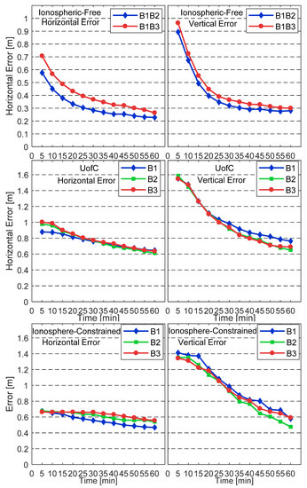 By using these four types of corrections, the convergence performance has been analyzed. For the DF-PPP, it takes 8 and 15 min for the B1B2 and B1B3 ionospheric-free kinematic solutions to converge to a horizontal precision of better than 0.5 m, and the convergence time is of 15 and 18 min for their vertical precision to be better than 0.5 m. For the SF-PPP, the UofC model has a longer convergence time than the ionosphere-constrained approach, which is caused by the higher noise. In general, the kinematic SF-PPP can converge to 0.8 m in horizontal and 1.0 m in vertical with 30 min.