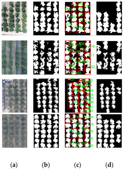 The background in the images was removed based on color differences, as the plants were distinctively green. The ExG index and Otsu’s method were applied because they were well tested in image segmentation of different agricultural scenarios [32,33,34]. Figure 4b shows the resulting binary images after applying ExG and Otsu. The ExG index is defined as follows:
