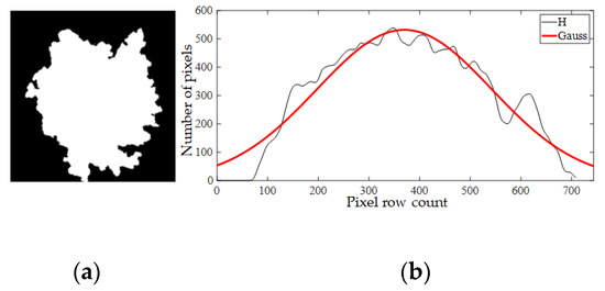 The original image was cropped into individual trees and converted into a binary image for the test. A total of 370 samples were obtained after the projection. We assumed that each sample obeys H~N(µ,σ2). Probability density distribution of H: