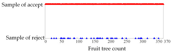 Figure 6 shows a hypothesis test of distribution for a total of 370 trees. According to the statistics, 89.6% of fruit trees projection histograms satisfied the assumption of Gaussian distribution. Five group examples of estimating parameters and statistics are presented in Table 1. Therefore, the projection histograms of fruit trees could be modeled as Gaussian probability density functions, which would provide the theoretical basis of image segmentation in the next step.
