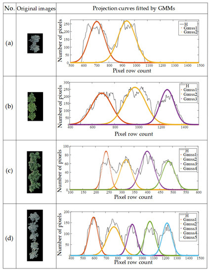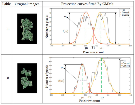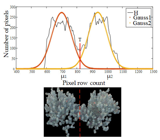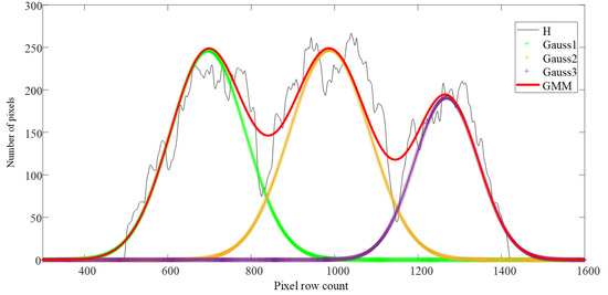 Multiple local minimum points in the data made it difficult to determine the threshold value. To solve this problem, a relationship between the GMM and the intermingling trees was established to seek an estimate of the GMM parameters for the threshold value. Figure 7 shows the projection histogram of interlacing fruit trees with a multimodal distribution.
