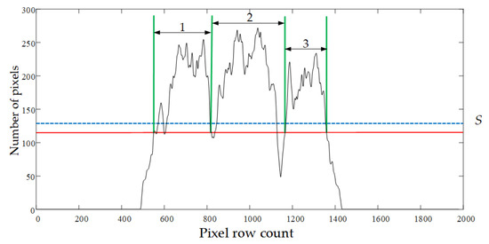 (1) The scanline was established to scan the projection histogram curve by a line from bottom to top. The scan region was limited between the bottom of the projected histogram and the end position as shown in Figure 8. The end position was defined as line S = H + Hstd/2. The median H and standard deviation Hstd were obtained using the expression