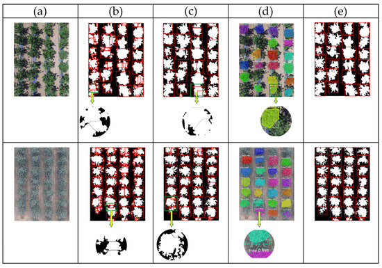 The orchard image samples used include several extreme cases, in which some trees may be heavily intermingled, and some barely have overlapping branches. The extremities were manually picked out and checked through the proposed method, as well as the other three formulas. This section compares the results in the more complex scenarios (Figure 15a), where canopy overlapping can be too hard to identify even for an expert, and in less complicated cases (Figure 15b).