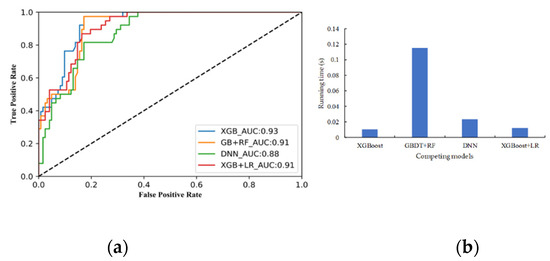Figure 18a shows the ROC curves and AUC results of the four evaluation models of their intermingledness Passessment. The ROC curve of XGBoost classifiers was close to the upper left corner and the AUC value was 93%. This means that the XGBoost had fewer errors. In comparison, the POC curve of XGBoost + LR and DNN classifier were lower than XGBoost’s, while GDBT + RF had lower AUC (91%). Figure 18b also shows the running time of the four evaluation models. XGBoost had the shortest running time (0.0104 s) of the four, while GDBT + RF had the longest (0.115 s). Overall, the XGBoost model outperformed the other three models, yielding the highest comprehensive performance on the test and validation sets.