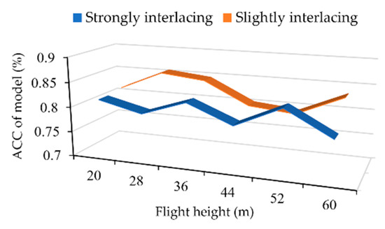 Figure 19 shows the accuracy of the model using photos taken at different flight heights. When the branches were not heavily crossed, the ACC value at 28 m was the highest. As the interweaving situation became more complex, however, the ACC declined. Pearson correlation coefficient (PCC) was introduced to measure the strength of the linear relationship between the model accuracy and the flight altitude [51]. Based on the data in Figure 19, the values of Pearson’s correlation were −0.257 and −0.326, respectively, under different intermingling conditions, and −0.260 for total test images. The results show that the photographing heights have no obvious effects on the model accuracy.