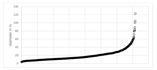 In total, 716 burial mounds were found based on the WorldView-2 data within the borders of the area of interest. Since all recognizable mounds and not only very large burial mounds were mapped, there is a substantial portion of smaller mounds between around 5 m and 20 m which do not necessarily date to the Early Iron Age and might have served other purposes than burial (Figure 3). It also cannot be assumed that all of these small archaeological features were found. The complete set of data is thus heterogeneous for the smaller monuments. The smaller mound structures merely represent a selection of highly visible monuments mostly in the vicinity of larger burial mounds. Since most large burial mounds do have a periphery of smaller stone monuments [6], circular features in the immediate vicinity of a large burial mound are contextualized and thus more easily recognizable as archaeological structures.