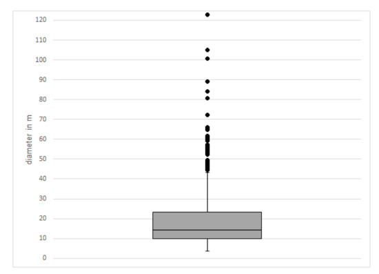 Box plot of mound diameter distribution excluding outliers (interquartile range × 1.5). Median: 14.2 m; Q1: 10.0 m; Q3: 23.4; Min: 3.8 m; Max (excluding outliers): 43.4 m.