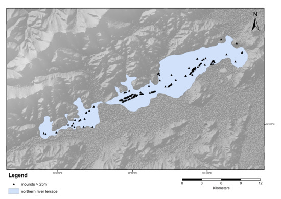 Given these discoveries, the Valley of the Kings in southern Siberia can be considered among the most important archaeological landscapes for the study of “Scythian” material culture and the emergence of highly mobile nomadic pastoralism. However, the cultural heritage of the Eurasian steppes, in particular burial mounds, is under threat from looting [11] and other anthropogenic taphonomic processes, e.g., agricultural activity. Apart from a skeletal map published by Gryaznov in 1980 [12] (p. 4), few spatial data sets of this archaeological landscape have been generated and none are publicly available. In order to assess the extent of the “royal” necropolis in the Uyuk Valley, first and foremost accurate mapping of all large burial mounds is a desideratum. It is so far unclear how many large burial mounds exist on the northern terrace of the Uyuk River, how large these burial mounds are, what their spatial distribution is, and how they relate to each other.