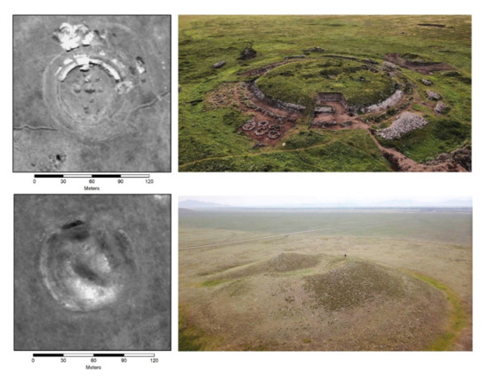 Recent years have seen a rapid development in methods for archaeological remote sensing. Since mound-like archaeological features are a wide-spread and relatively homogenous phenomenon, archaeological landscapes with mounds are an ideal case for semi-automated and automated methods of classification and detection. Such methods were specifically applied with LiDAR-derived digital elevation models based on convolutional neural networks for identifying Neolithic mounds [13,14], and object-based approaches to find earthen mounds and shell heaps [15]. Other approaches used high-resolution optical satellite data, like Ikonos-2, and applied a random forests algorithm [16] or developed a training dataset for a neural network based on Google Earth images [17]. However, given the relatively small area of interest in the current study, it was decided to stick with a traditional visual interpretation. The number of large “royal” burial mounds in the Uyuk Valley, while large with respect to being a single archaeological site, is nonetheless small for generating a training dataset for more sophisticated machine learning approaches.